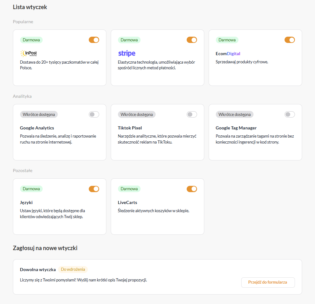 Wtyczki są zintegrowane z platformą i aktywujesz je bezpośrednio w panelu sklepu.