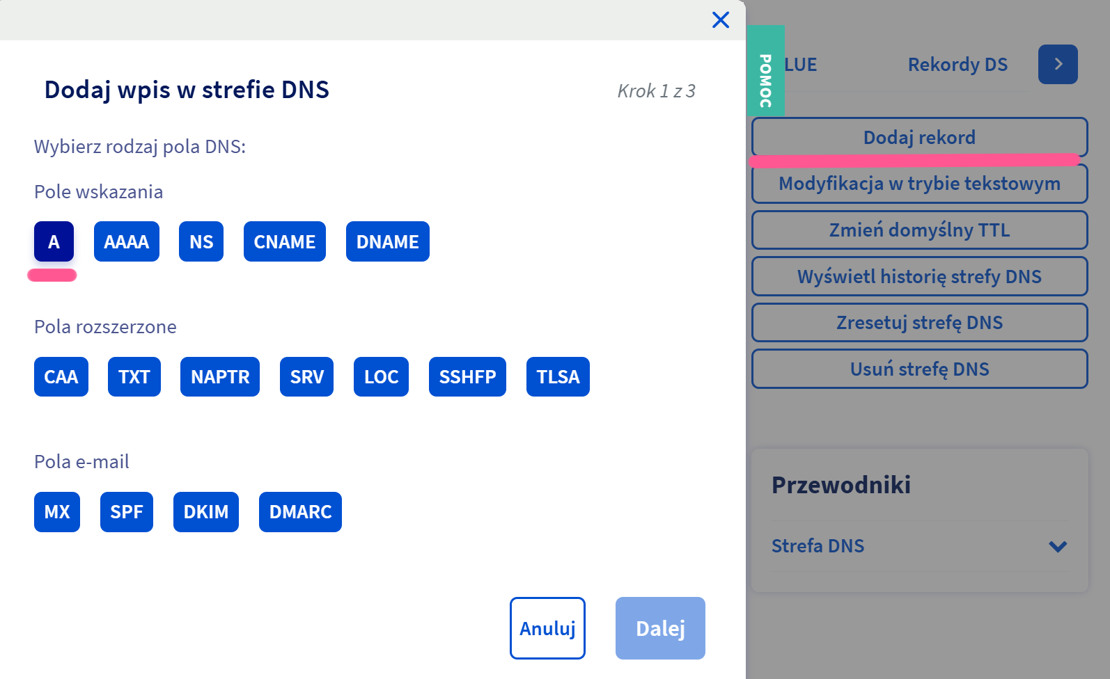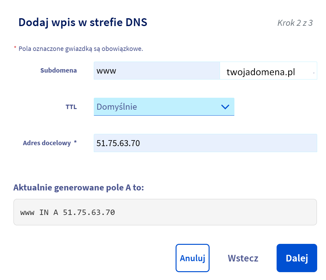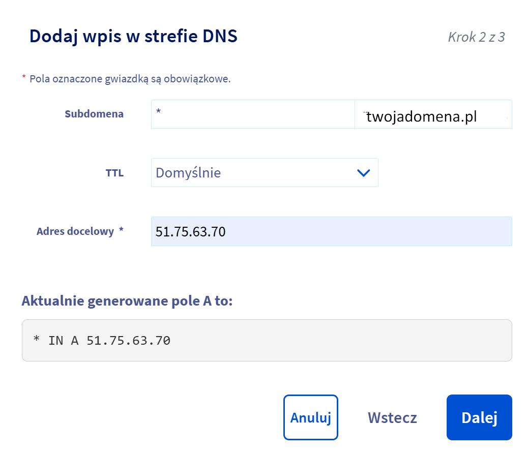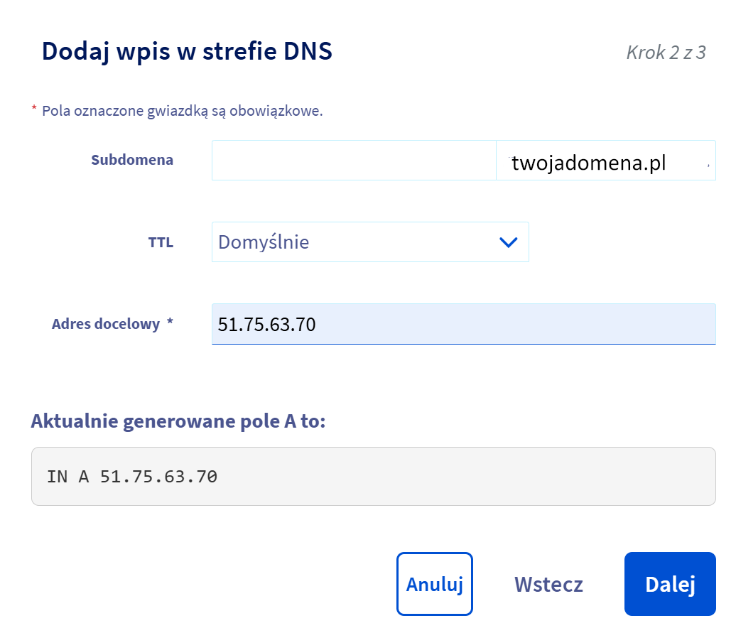 Przejdź do zarządzania DNS. W widoku zarządzania DNS będziesz dodawać nowe rekordy. Liczba i nazwy pól mogą się różnić u poszczególnych dostawców, ale logika pozostaje taka sama.