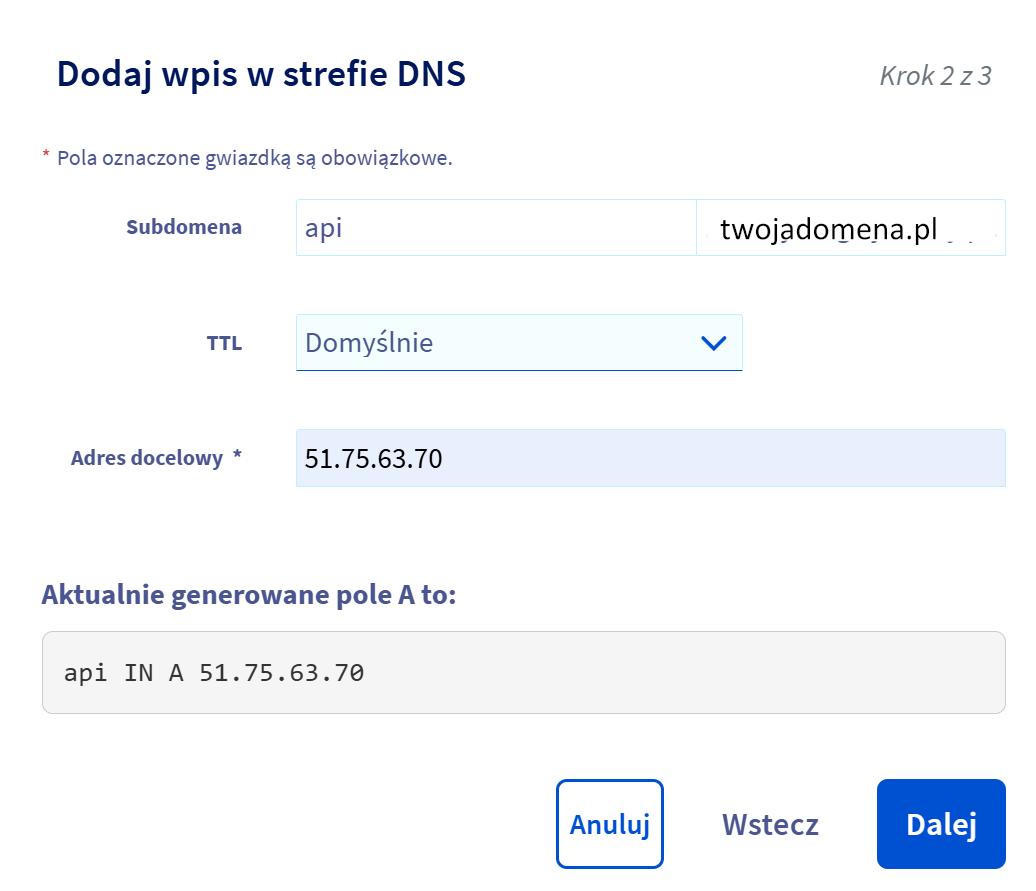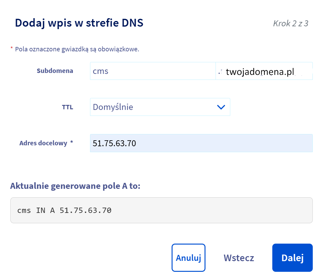 Istnieje również możliwość utworzenia typów rekordów innych niż A. W przypadku problemów z działaniem wyżej podanej instrukcji, spróbuj utworzyć rekord A dla subdomeny z pustym polem, a dla api, www i cms - rekord typu CNAME.