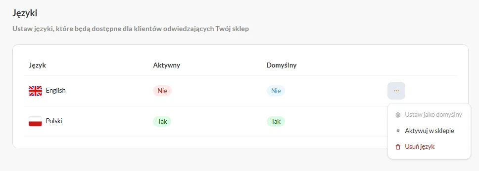Kliknij w trzy kropki obok języka, który chcesz aktywować, np. „English”, i wybierz „Aktywuj w sklepie”.
